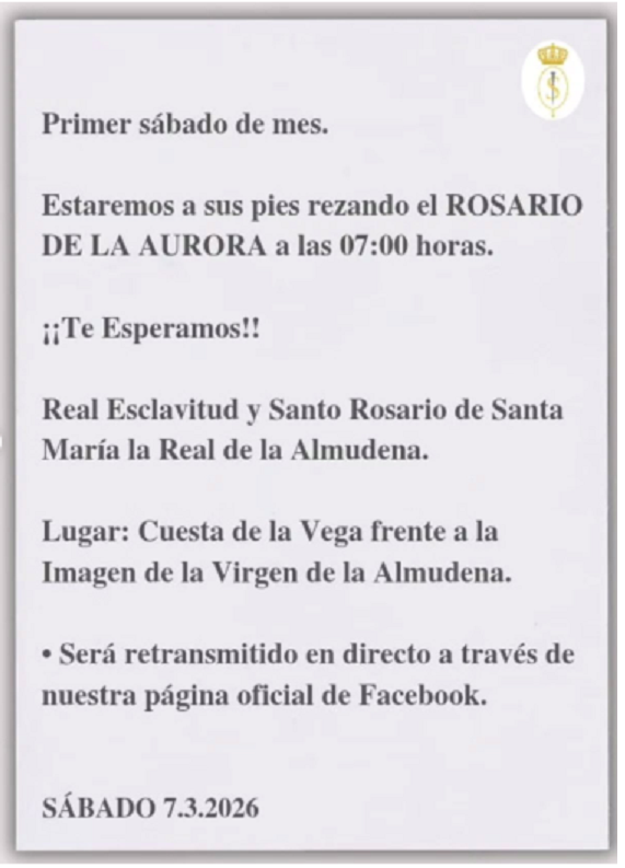 En este mes de marzo, os convocamos al Rosario de la Aurora a las 07:00 horas del sábado 07 de marzo, en la Cuesta de la Vega frente a la Imagen de la Virgen de la Almudena.